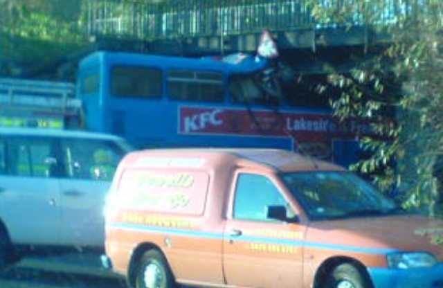 The photo at the bottom of this article outlines the extent of the damage. The bridge had acted as a tin-opener, peeling the roof off. As we went past, and for the rest of the day, I was preoccupied. The double deckers usually take a different route to avoid the bridge. This was obviously a new driver. But it happened in the mroning, with no passenger. If this had happened in the evening, there would have been 70-odd 16-18yr olds on that bus, and for those in the front half of the top deck it would have been game over.